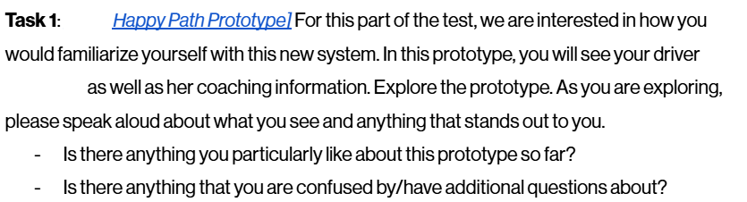 For the first half of 2023, our research team sought to elevate and validate our understanding of coaching through a combination of safety manager interviews, driver interviews, and quantitative surveys. My contributions to this phase of work focused on semi-structured safety manager interviews covering a broad range of topics to help us assess customer needs. I also provided research support for the designers seeking to validate and iterate on their work through user testing.