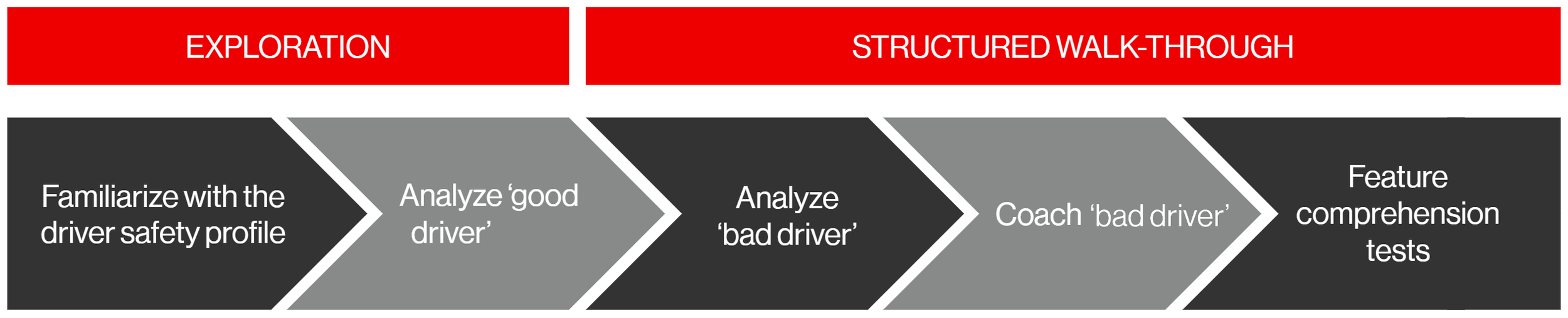 This research impacted roadmap decisions for safety score development and directly led to the customization research below, but it was also an important milestone for both Daragh and me: he elevated his experience with evaluative research, and I had my first experience with formal 1:1 mentorship of a junior team member. This experience directly prepared me for future direct mentorship roles, including my work on the Driver Exoneration Journey Mapping project.