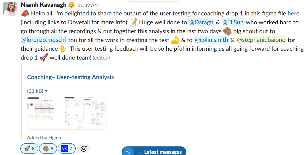 As research continued, so did design work. One designer on the team, Daragh, had been expressing an interest in diving deeper into research work, and his work on the coaching platform's safety score functionality needed validation. This was an opportunity for me to step in and assist Daragh in conducting task-based usability tests for his prototyped experience.