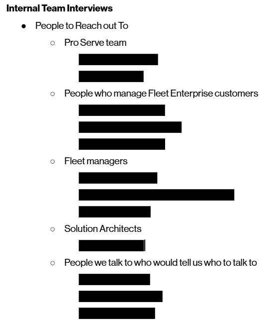 This research focused on the nuances of safety scores, a feature not yet launched to our existing customers. It didn't make sense to ask them, as "how might you use this feature in the future?" is a notoriously unreliable and poor research question. So I got creative: I leveraged both my and my stakeholders' internal networks at Verizon Connect (we have over 3,500 employees) and sought out teams I was less familiar with who worked in areas that related to safety scores, planning unstructured interviews with those coworkers.