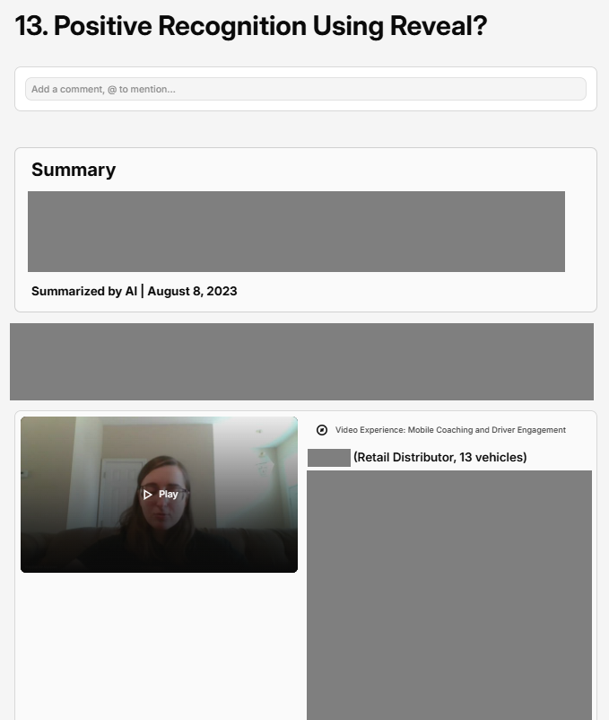 Fleet management technology like Verizon Connect’s Reveal tracks expansive amounts of information about company vehicles, doubly so if dashcams are in the picture. Reveal Video aggregates dashcam data as a list of ‘harsh driving events’, rated from minor to critical by an AI engine, and stores the videos for user review. For small fleets with well-behaved drivers, this is a handy tool for reviewing the occasional minor hazard. For medium to large to enterprise fleets, it quickly becomes an unwieldy and exponentially growing repository of videos you don’t have time to watch. We learned from user feedback that this was a common source of lost value among customers, who were too busy with other tasks to devote the necessary time to coaching.