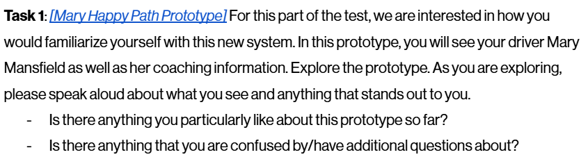 In research planning, we determined that getting an unbiased picture of drivers' wants and needs from fleet managers, our typical interview participants, was impossible. We needed to talk to drivers too. To consolidate resources and speed up our research timelines, Colin and I combined these two topics into one interview. This allowed us to tackle both user groups without planning 4 separate research studies. In the end, I spoke to fleet managers about these combined topics while Colin spoke to drivers. I developed an 45 minute semi-structured interview, described below:
