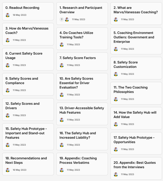 After conducting 10 interviews, 2 of which included an additional impromptu interviewee (a new and exciting challenge), I turned to Dovetail—Verizon Connect's new research repository—to analyze the data. I dove in headfirst and was the first member of the research team to analyze data and construct a research readout entirely using Dovetail (versus the team's traditional method of creating Google Slides powerpoints). This new format was a huge hit with my stakeholders on the safety team, because I could easily cite my sources directly to interview transcripts and incorporate far more customer testimonials than before. This format was adopted by the research team and became our standard readout methodology.