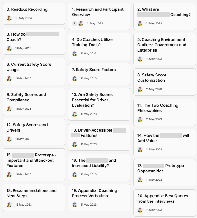 My Dovetail research readout for this work, organized into topic-based ‘insights’.