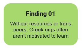 Findings: Through affinity diagramming, we identified four broad areas that influence Greek education, LGBTQ+ trainings, and transgender needs/experiences: individual, educational, social, and institutional factors. The following is one example of each: